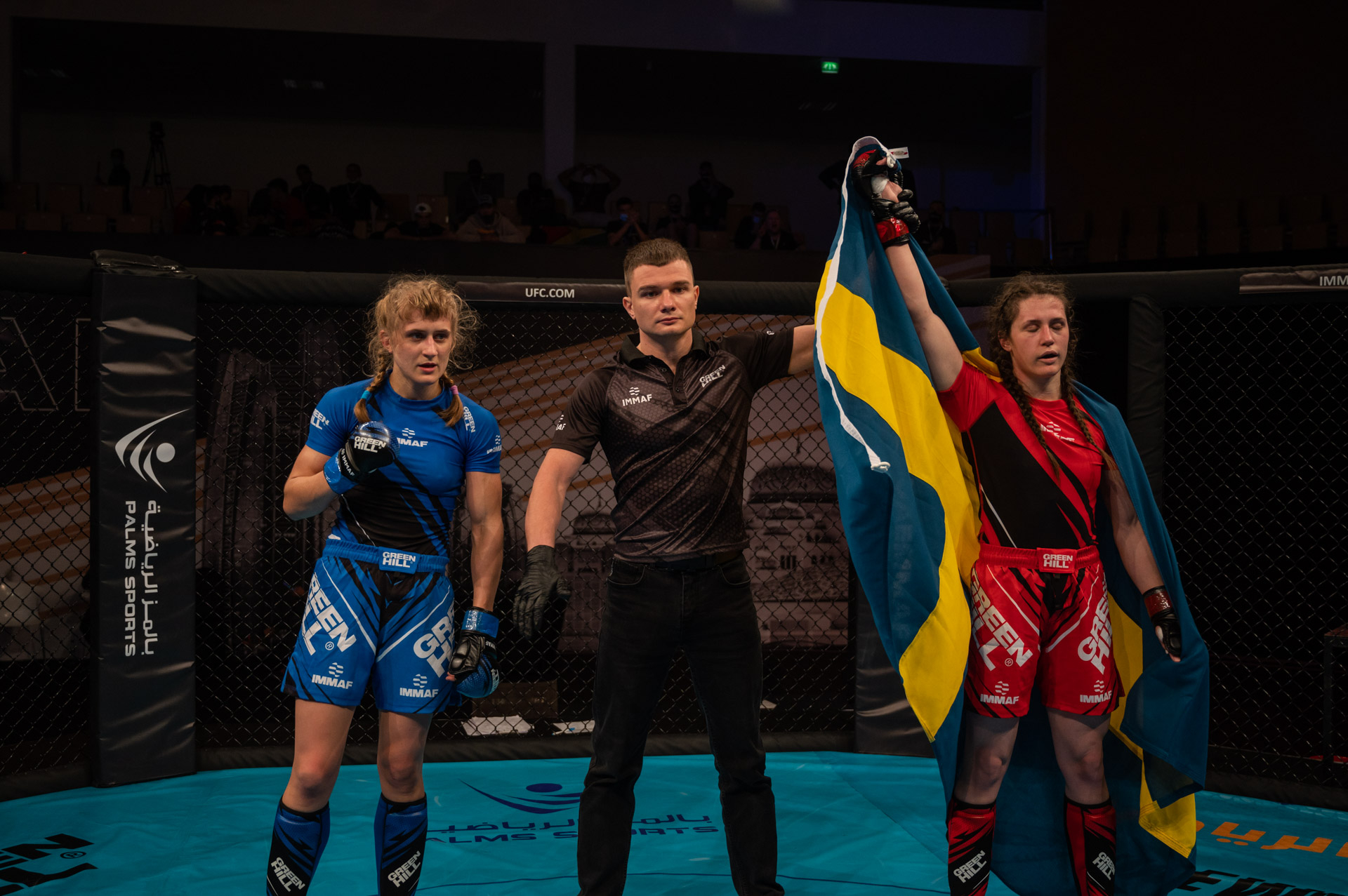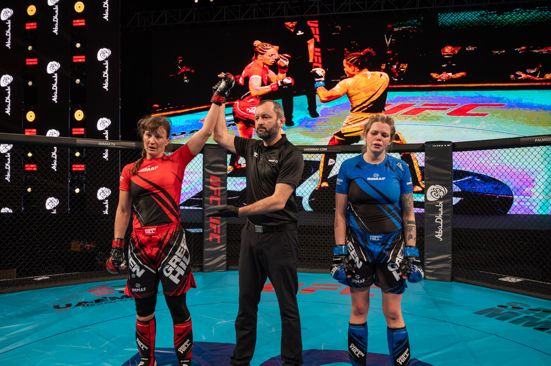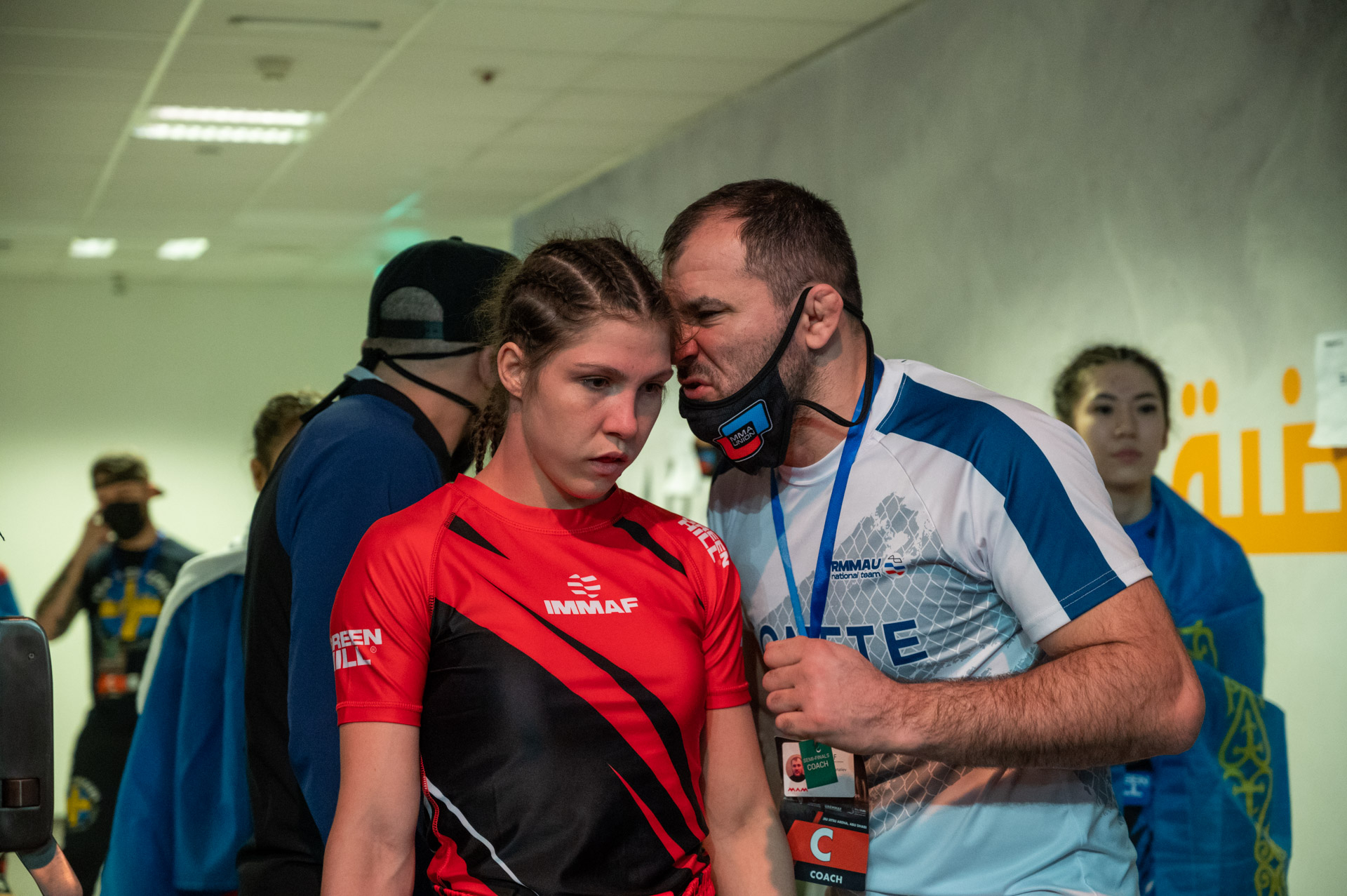 Лагодная — первая финалистка ЧМ из России Полуфинальные поединки начались с серьёзного испытания для Александры Митиной, выступающей в наилегчайшем весе. Опытнейшая бразильянка из Бахрейна Беатриз Диниз не оставила ей шансов в партере, где полностью превосходила в джиу-джитсу. Во втором раунде россиянка неплохо защищалась, но не могла разорвать клинч и выйти на комфортную для себя дистанцию, а решающая трёхминутка также осталась за Диниз, которая была близка к тому, чтобы задушить Митину из маунта, а на последних секундах обрушила на неё град ударов. Судьи отдали победу бразильянке единогласным решением, а Митина, проведшая очень хороший турнир, осталась с бронзой. В самой лёгкой весовой категории до 47,6 кг россиянка Яна Маркова также не смогла справиться с финкой Йенной Хорто.
